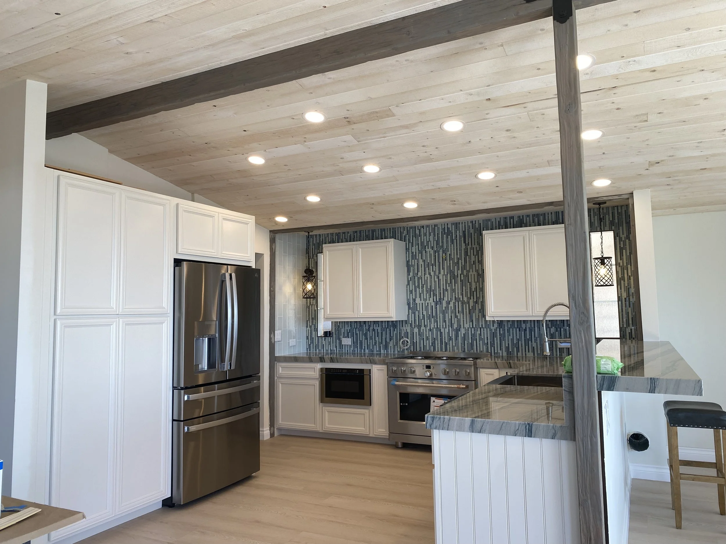 We were brought onto this job to finish the framing and install finishes in the home remodel that had been taken down to the studs. We installed tongue and groove ceilings, doors, casings and jambs, cabinets and crown moulding, built stairs, installed faux and structural beams, and consulted with the home owner on various other aspects of the project.